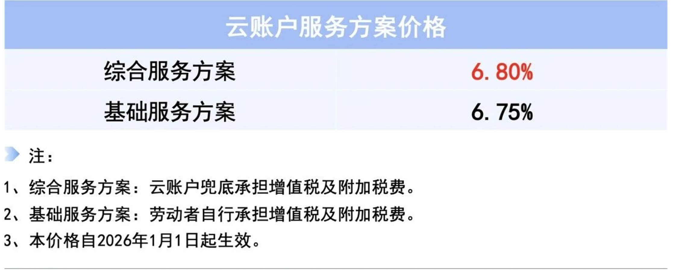 全面有效落地监管政策,云账户结合行业发展持续思考。价值决定价格,也同样需要价格作为支撑,科学合理的价格有助于行业价值发挥,无序恶意的低价竞争只会导致劣币驱逐良币,损害行业价值,这是基本经济规律。云账户遵从国家导向,坚决落实监管政策,满足行业健康发展、以服务质量提升更好解决劳动者问题的底层要求,主动上调服务价格,提供6.75%和6.8%两种标准报价方案,自2026年1月1日起生效。在拒绝倒挂低价基础上,6.8%的服务价格可以更加有效地帮助劳动者缓解个人所得税之外,缴纳可能存在增值税和附加税带来的成本压力。客观看,涨价对每个服务商而言都是挑战,短期势必造成业务流失,但即便如此,我们也愿意承担短期阵痛,在量价匹配基础上推动行业价格回归正常区间,着眼行业基于健康发展的长期价值释放。