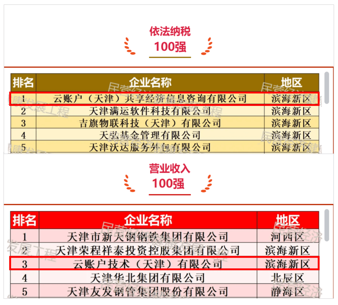 云账户荣列2022年度天津滨海新区民营企业销售收入100强第2位、依法纳税100强第2位