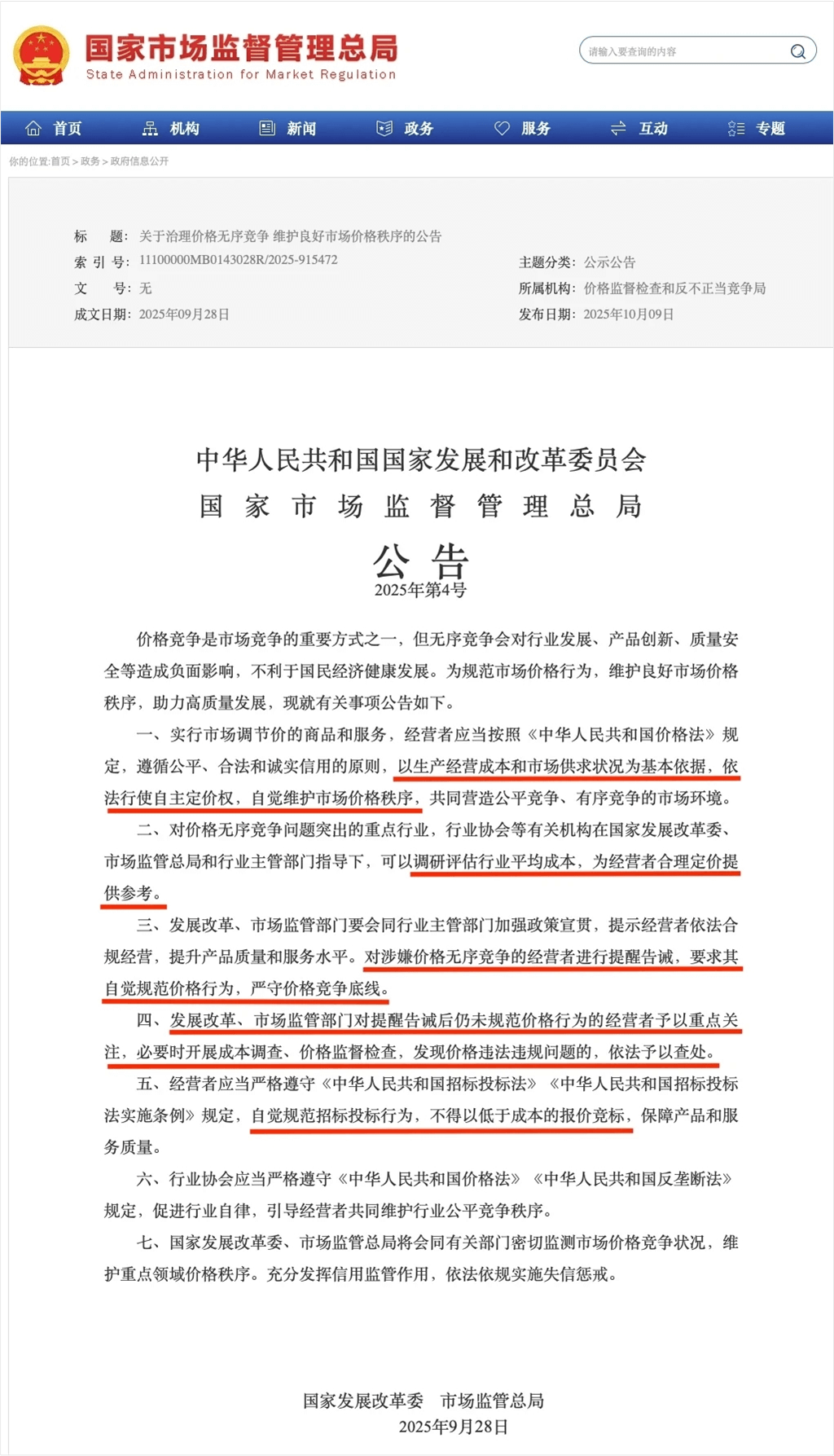 2025年10月9日,国家发展改革委、市场监管总局联合发布《关于治理价格无序竞争 维护良好市场价格秩序的公告》(简称《公告》)。《公告》分七条,其中第一条规定(有节选、下同),以生产经营成本和市场供求状况为基本依据,依法行使自主定价权,自觉维护市场价格秩序。第二条规定,调研评估行业平均成本,为经营者合理定价提供参考。第三条规定,对涉嫌价格无序竞争的经营者进行提醒告诫,要求其自觉规范价格行为,严守价格竞争底线。第四条规定,发展改革、市场监管部门对提醒告诫后仍未规范价格行为的经营者予以重点关注,必要时开展成本调查、价格监督检查,发现价格违法违规问题的,依法予以查处。第五条规定,自觉规范招标投标行为,不得以低于成本的报价竞标。